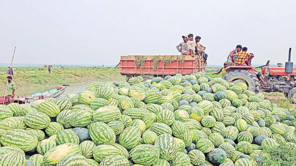 দুই চোখ যেদিকে যায়, সেদিকে শুধু তরমুজ আর তরমুজ। মাঠের পর মাঠজুড়ে তরমুজখেত। খেত থেকে তরমুজ তুলে এক স্থানে জড়ো করছেন কৃষক। দেশের বিভিন্ন এলাকা থেকে পাইকারি ব্যবসায়ীরা এসে খেত